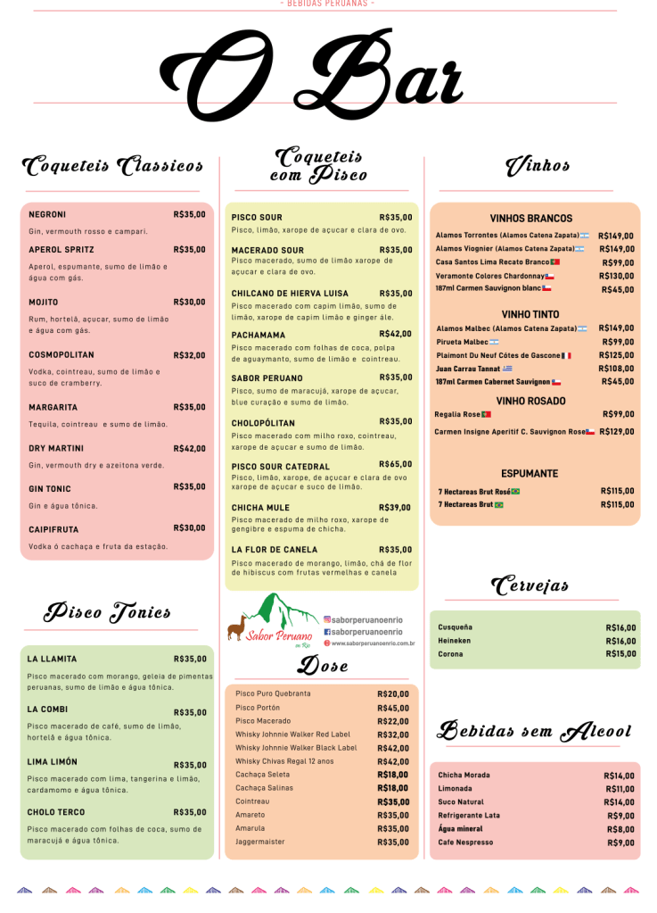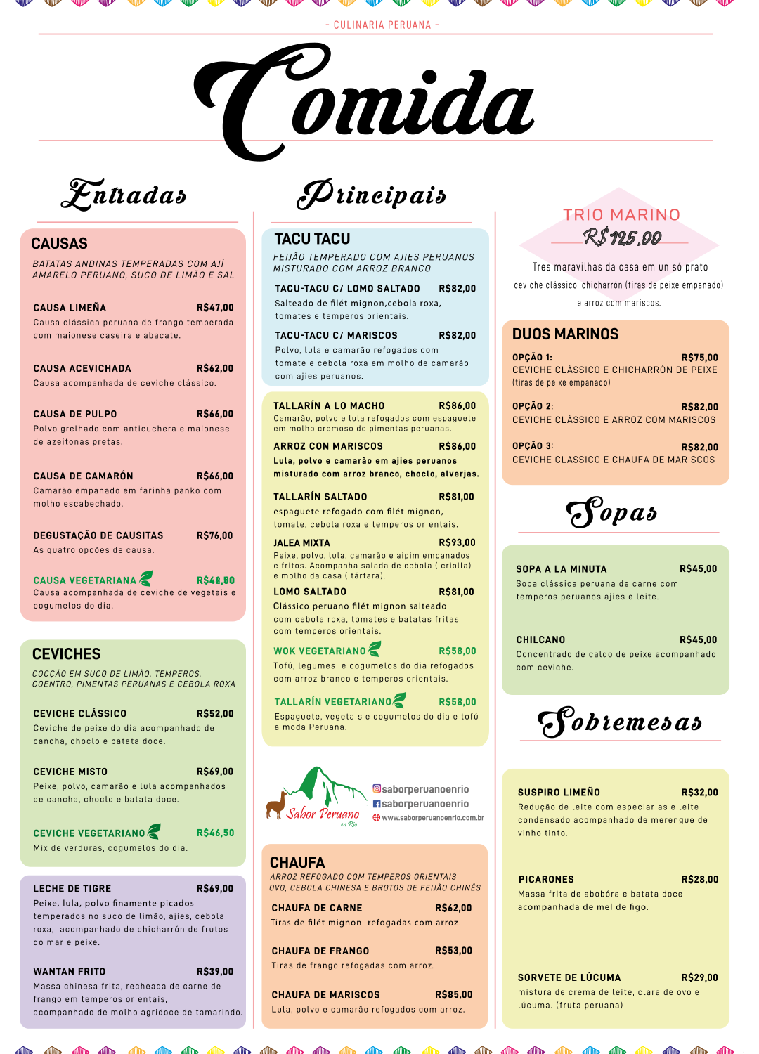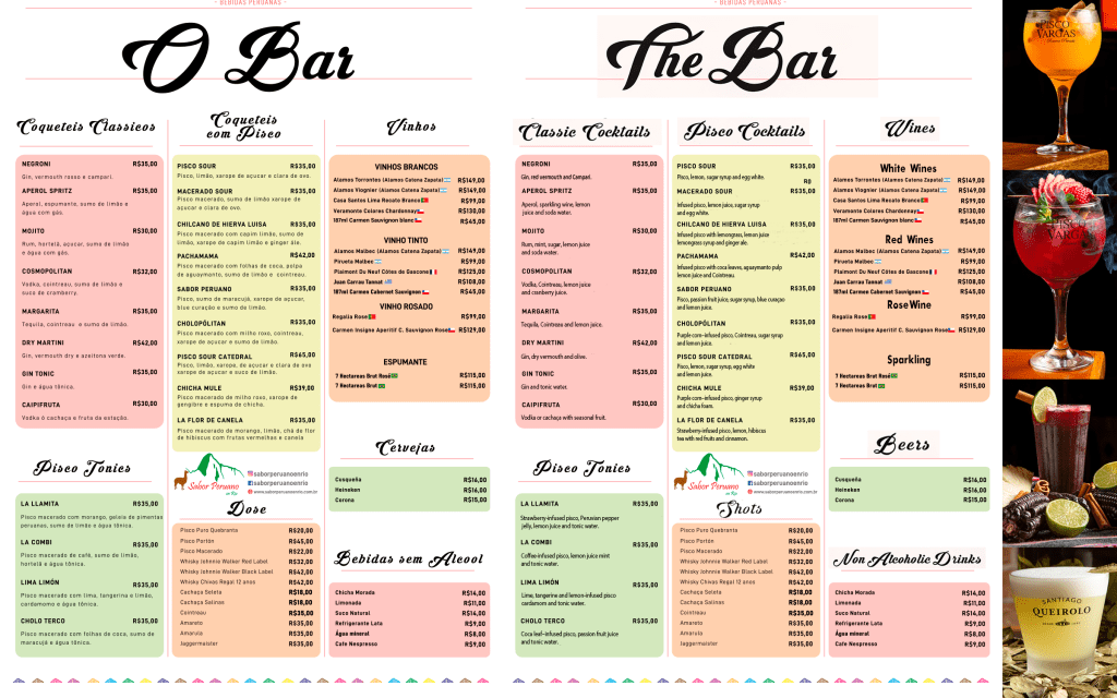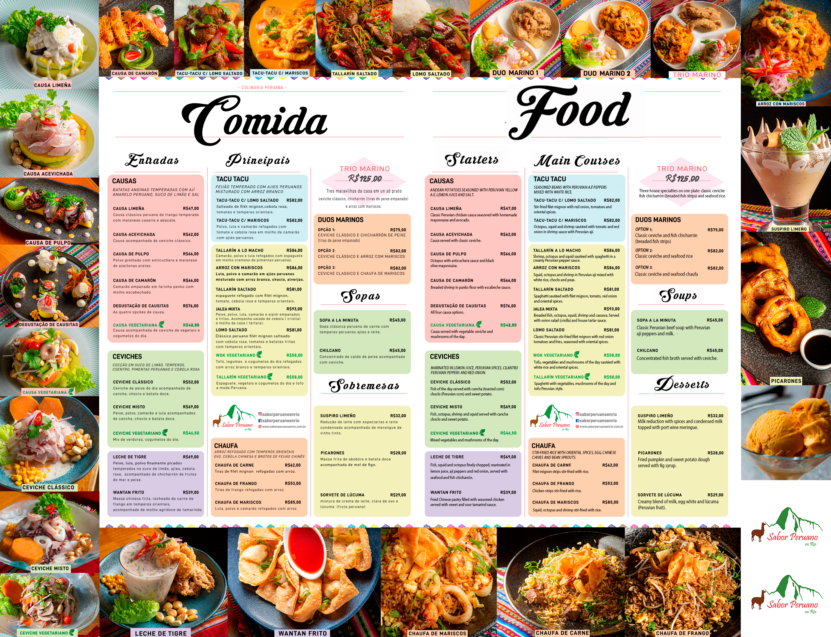 Explore nosso cardápio com uma variedade de pratos tradicionais peruanos, preparados com ingredientes autênticos e acompanhados de bebidas típicas que representam a riqueza da gastronomia andina.